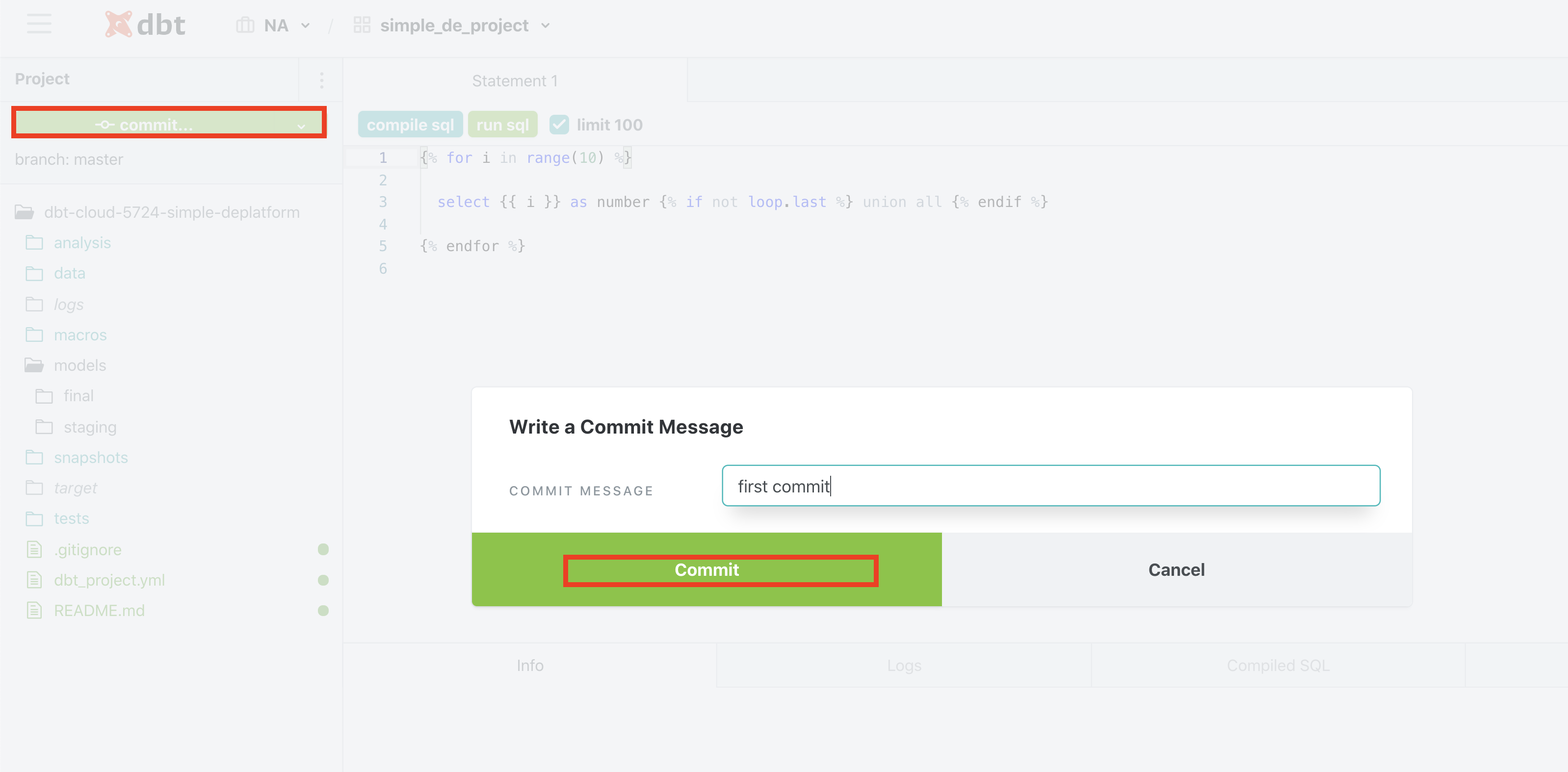 This will create a new project with its code repo managed by dbt cloud. Now click on Start Developing to start coding your project. Follow the steps below to initialize your project and create staging folder.