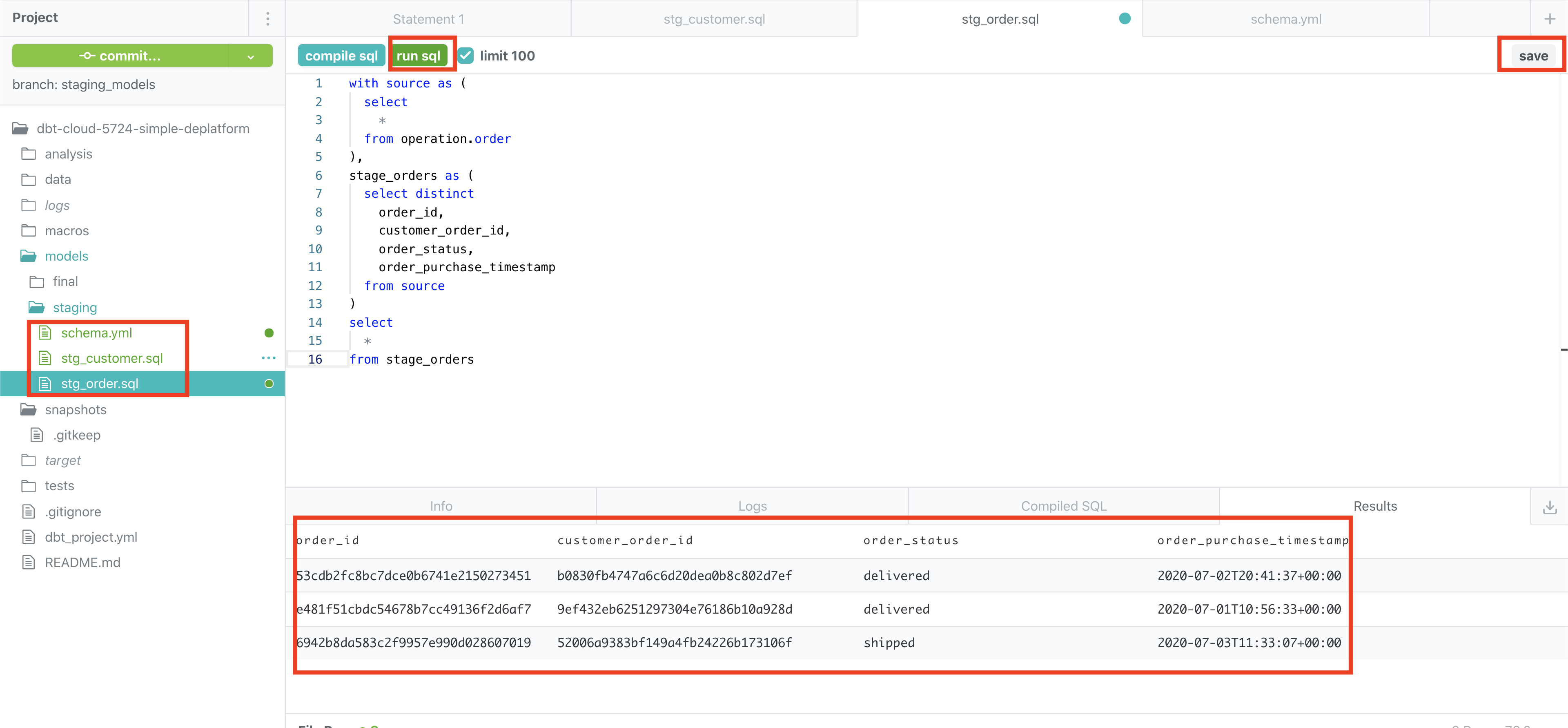 Log Replication: In thedatabase -> data warehousestitch integration we are using normal replication which basically does aselect * from source_table where some_dt_col > latest_dt_val_in_destinationquery to get the unloaded data. This is not a good pattern since this affects the source table performance by reading directly from the table, this can be crucial when used on an application table. In order to circumvent this we have to uselog based replicationwhich read from the database logs. This setup is a bit more involved and it is explained at here.Snapshot: If we look closely at our order table we can realize that it is a dimension that changes, i.eshipped->deliveredin such cases its better to use a SCD2 pattern. This can be done usingdbt’s snapshot feature.code repo: In outdbtexample we directly used the UI to create models and write test cases, this is not ideal. It is better to have a code repository ingithub, etc and follow standard feature release process, before merging it to the master branch which controls the production data pipelines. You can learn more about setting up adbtrepo here.dbt best practices: When usingdbtthere are certain best practices, you can check them hereYou will notice that the data is duplicated in