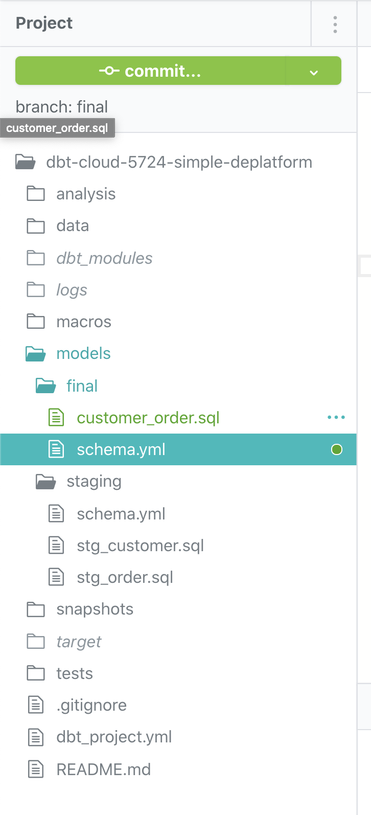 Now we can create our final model. Create a file customer_order.sql in the location models/final/customer_order.sql, with the following content
