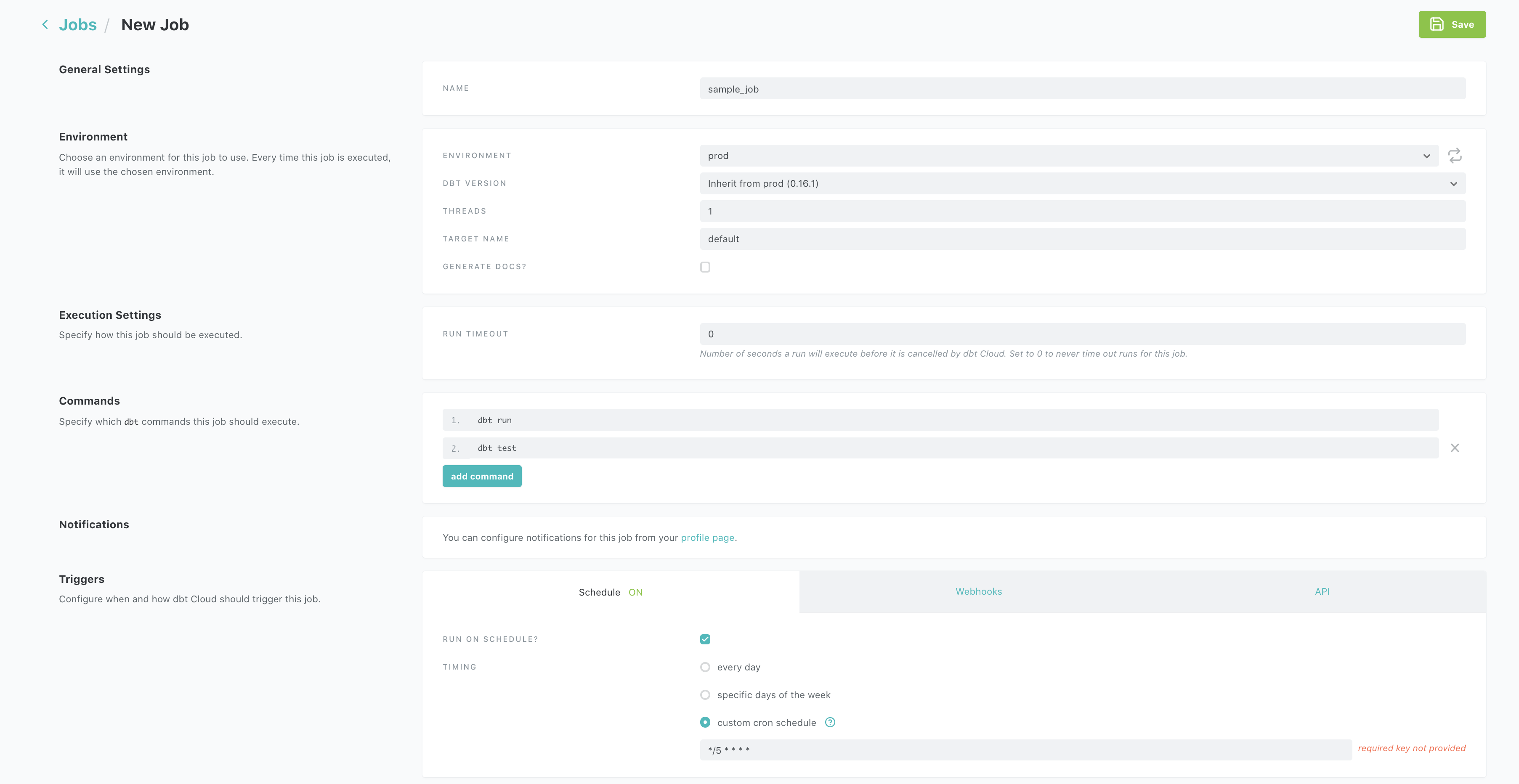 Let’s create a job called sample_job, set it to run every 15min using the UI, with cron scheduler as such */5 * * * * which denotes every 15 min. Click on the hamburger icon -> Jobs -> New Job. Make sure to add the command dbt test to your commands section and then save it.