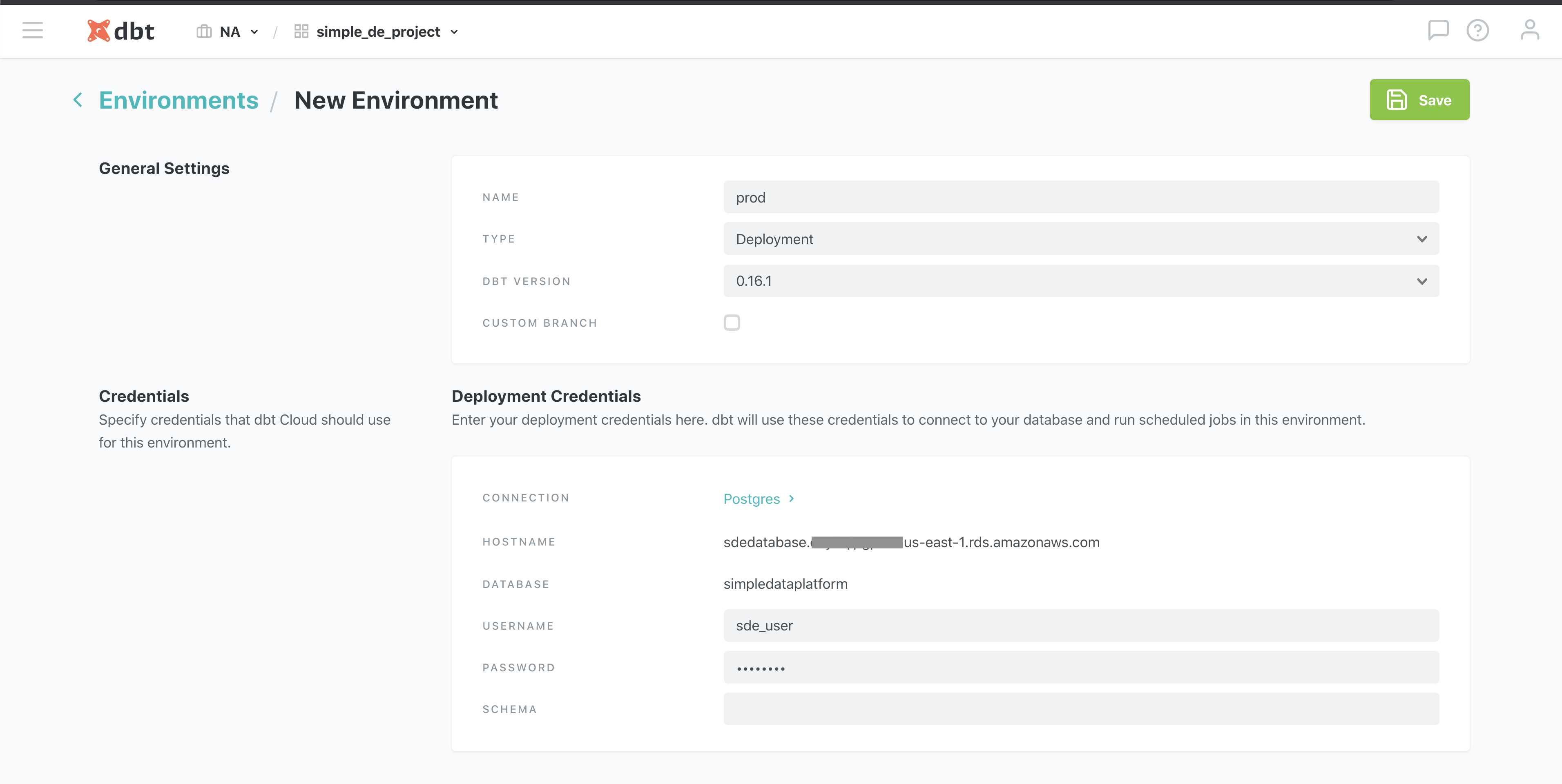 Now that we have our ELT process defined, and have the EL parts running with a frequency of 10min, its time to schedule the T part. But first we have to define a production(aka deployment) environment to run this in. Click on the hamburger icon -> Environments -> New Environment
