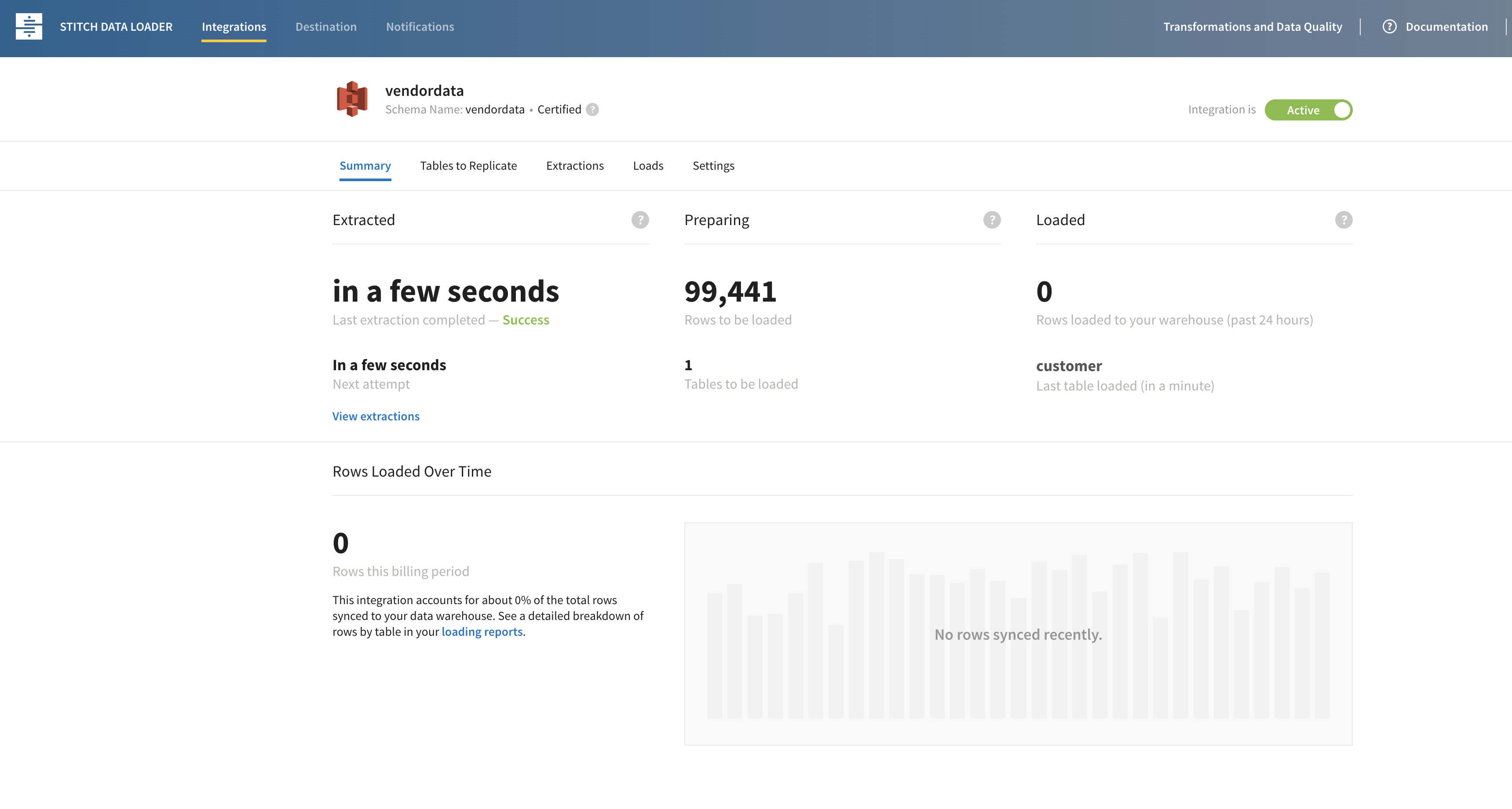 Once you switch on the stitch data pipeline, you will see that the data extraction and load is complete from the UI