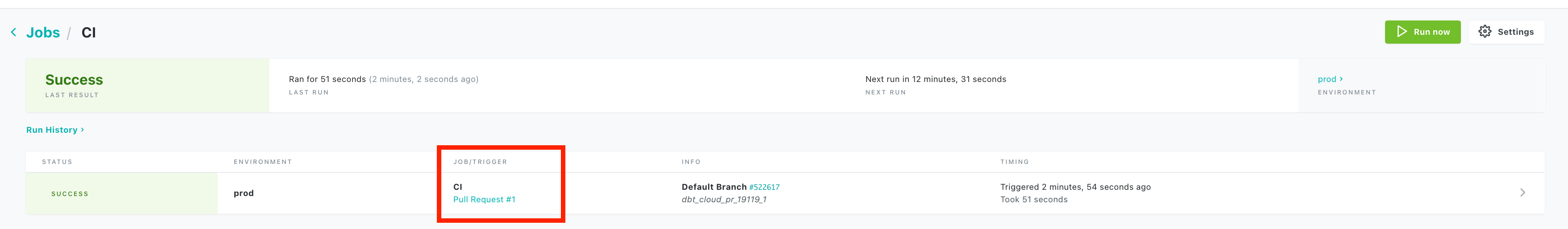 In the dbt_development repository in your github UI click on the create pull request prompt. When you create a PR, a CI job is run and its status is added to your PR.