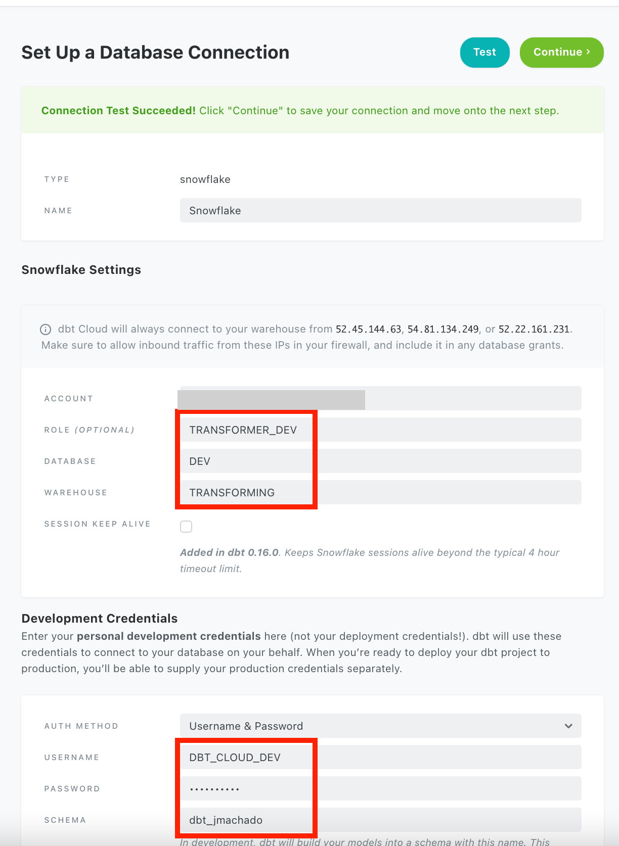 Choose Snowflake as your data warehouse and in the connection settings, use your DBT_CLOUD_DEV username and password for the development environment.