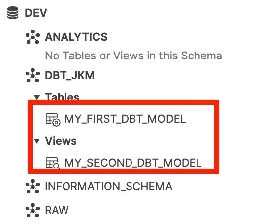 If you log in to your snowflake console as DBT_CLOUD_DEV, you will be able to see a schema called dbt_your-username-here(which you setup in profiles.yml). This schema will contain a table my_first_dbt_model and a view my_second_dbt_model. These are sample models that are generated by dbt as examples.