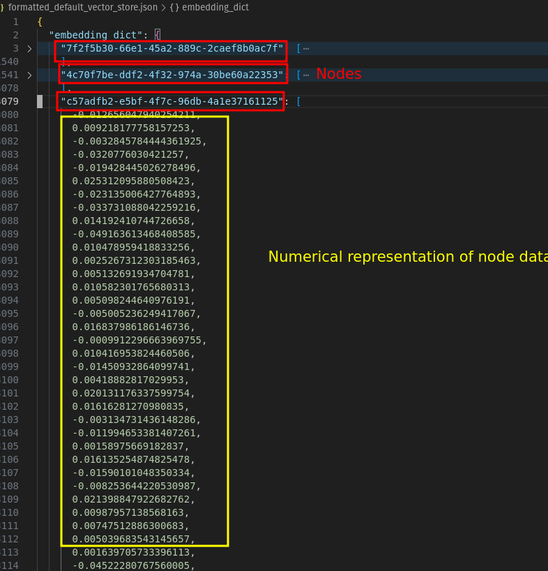 Our nodes are converted to embeddings using the LLM API (OpenAI API in our case). The results are stored in a database (local file in our case).