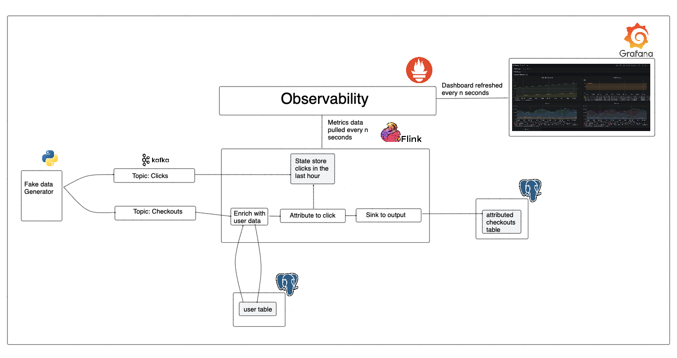 - The enriched and attributed checkout data is logged into a Postgres sink table.