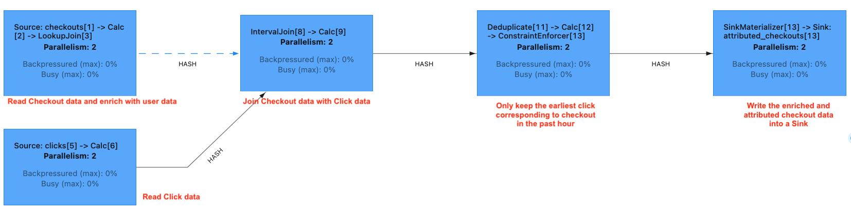 We see that we match checkouts with clicks between the click time and 1 hour after the click time. The time interval joins criteria shown above ensures that we only need to keep clicks that happened in the last hour (of the checkout time) in the state.