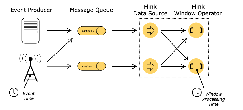 - Processing time: The time when the event is processed by a system (e.g., Apache Flink), defined as