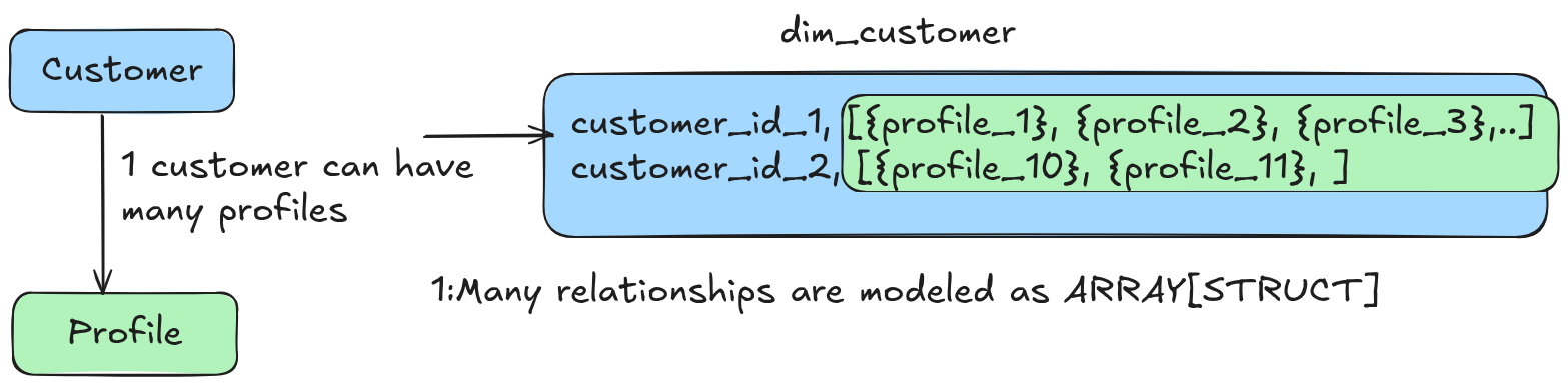 - 1:M: One row in a table can be related to M rows in another. For example, one customer can have multiple profiles. In this case, the profile will be an ARRAY[STRUCT] in the customer dimension.