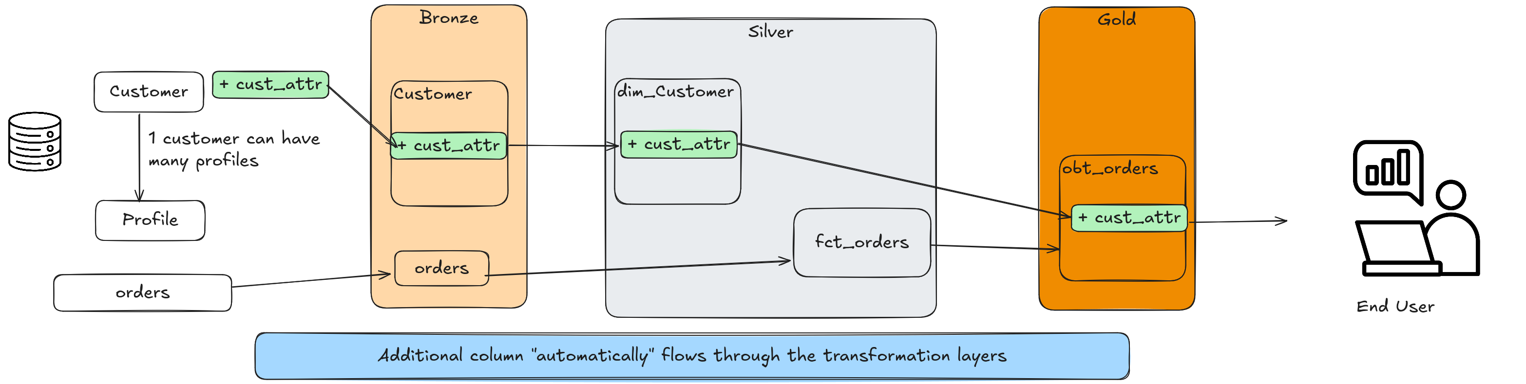 If your fact table that has a customer_id decides that each order will now record the profile id, you would need to update your pipeline logic.