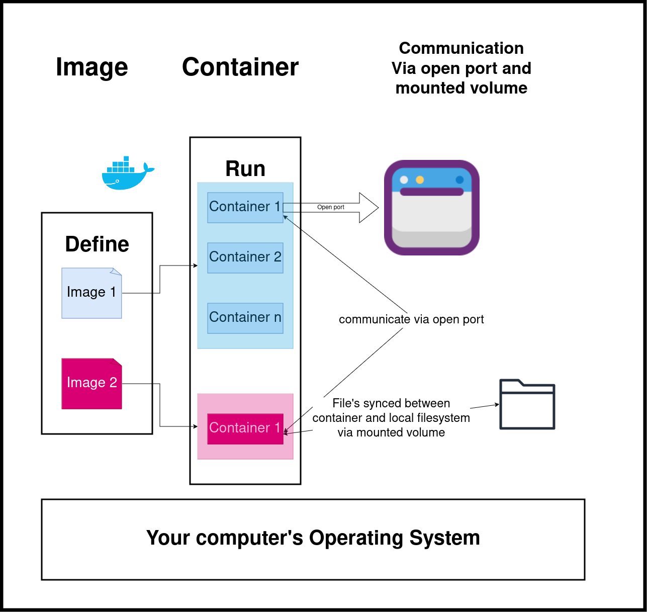 - Enable containers to talk among each other and the local OS with ports and mounted volumes