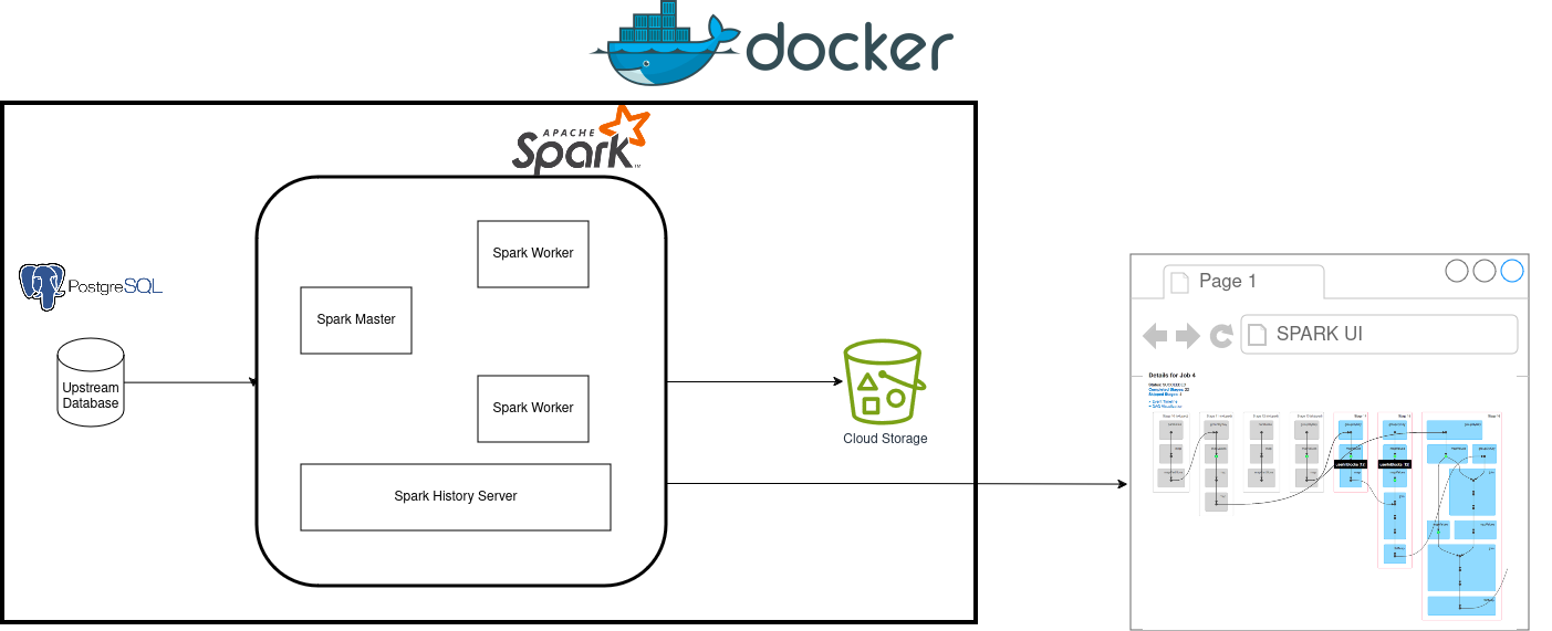Postgres database: We use a Postgres database to simulate an upstream application database.Spark cluster: We create a spark cluster with a master and two workers, where the data is processed. The spark cluster also includes a history server, which displays the logs and resource utilization (Spark UI) for completed/failed spark applications.Minio: Minio is open-source software that has a fully compatible API with the AWS S3 cloud storage system. We use minio to replicate S3 locally.createbuckets: This is a short-lived docker container that creates the necessary folder structure in our minio storage system before turning off.
