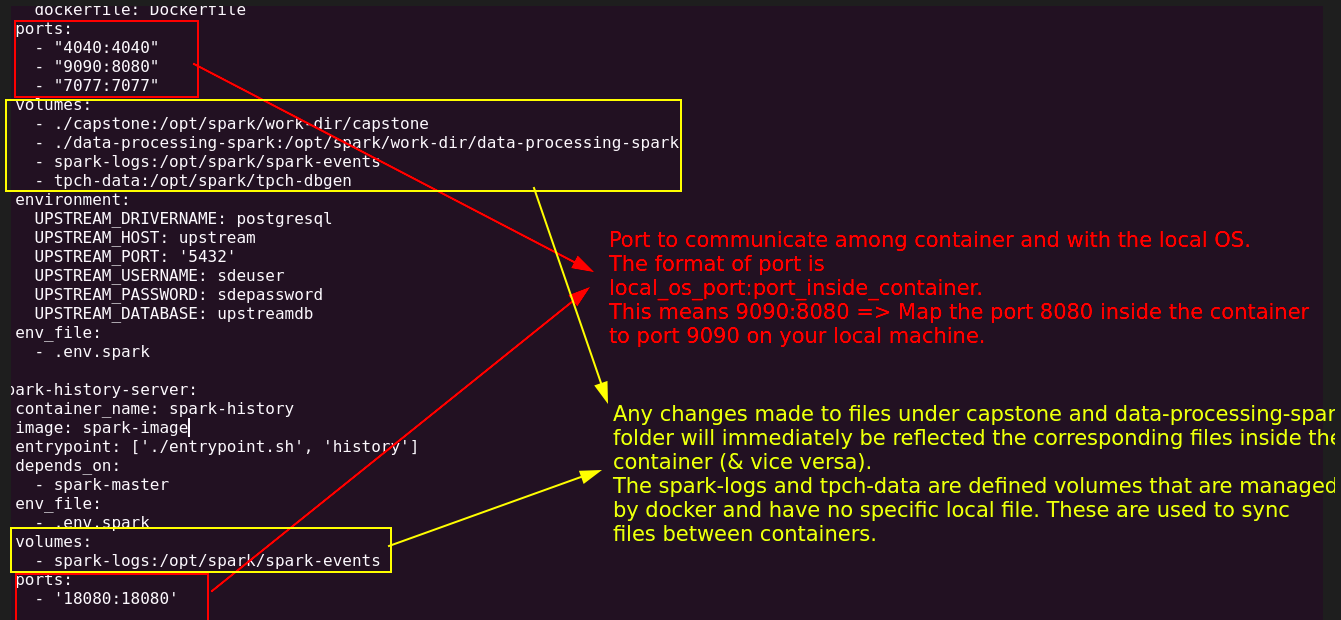 Typically, with data infra, multiple containers run. When we want the container to communicate with them and the local operating system, we need to enable it via ports for http-based interactions. In our example, we ensure that Spark clusters can talk with each other and with the local operating system by defining ports in our docker-compose.yml file.