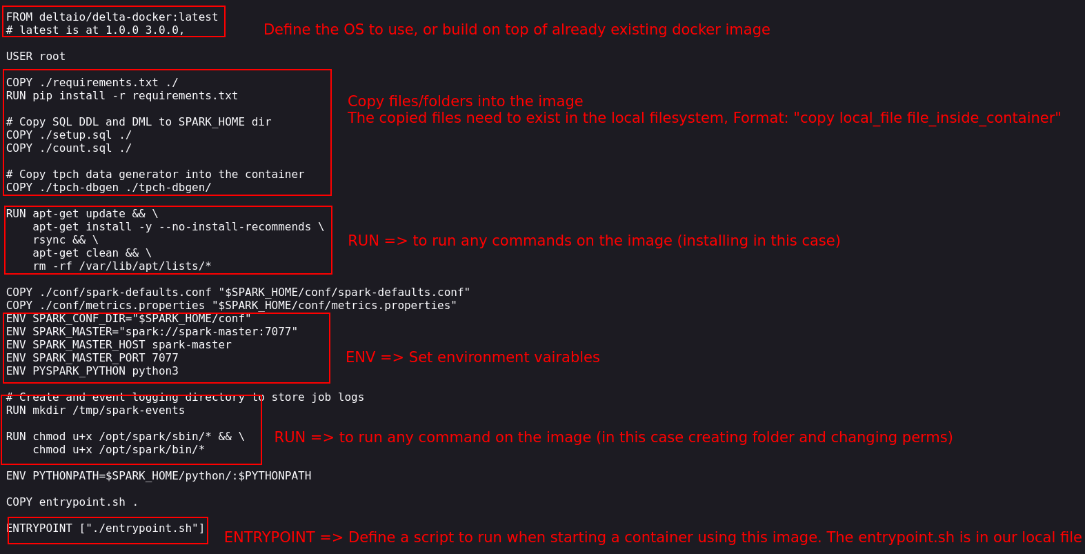 FROM: We need a base operating system on which to set our configurations. We can also use existing Docker images available at the Docker Hub and add our config on top of them. In our example, we use the official Delta Lake Docker image.COPY: Copy is used to copy files or folders from our local filesystem to the image. The copy command is usually used when building the docker image to copy settings, static files, etc. In our example, we copy over thetpch-dbgenfolder, which contains the logic to create tpch data. We also copy over our requirements.txt file and our entrypoint.sh file.RUN: Run is used to run a command in the shell terminal of your image. It is typically used to install libraries, create folders, etc.ENV: This command sets the image’s environment variables. In our example, we set Spark environment variables.ENTRYPOINT: The entrypoint command executes a script when the image starts. In our example, we use a script file (entrypoint.sh) to start spark master and worker nodes depending on the inputs given to the docker cli when starting a container from this image.