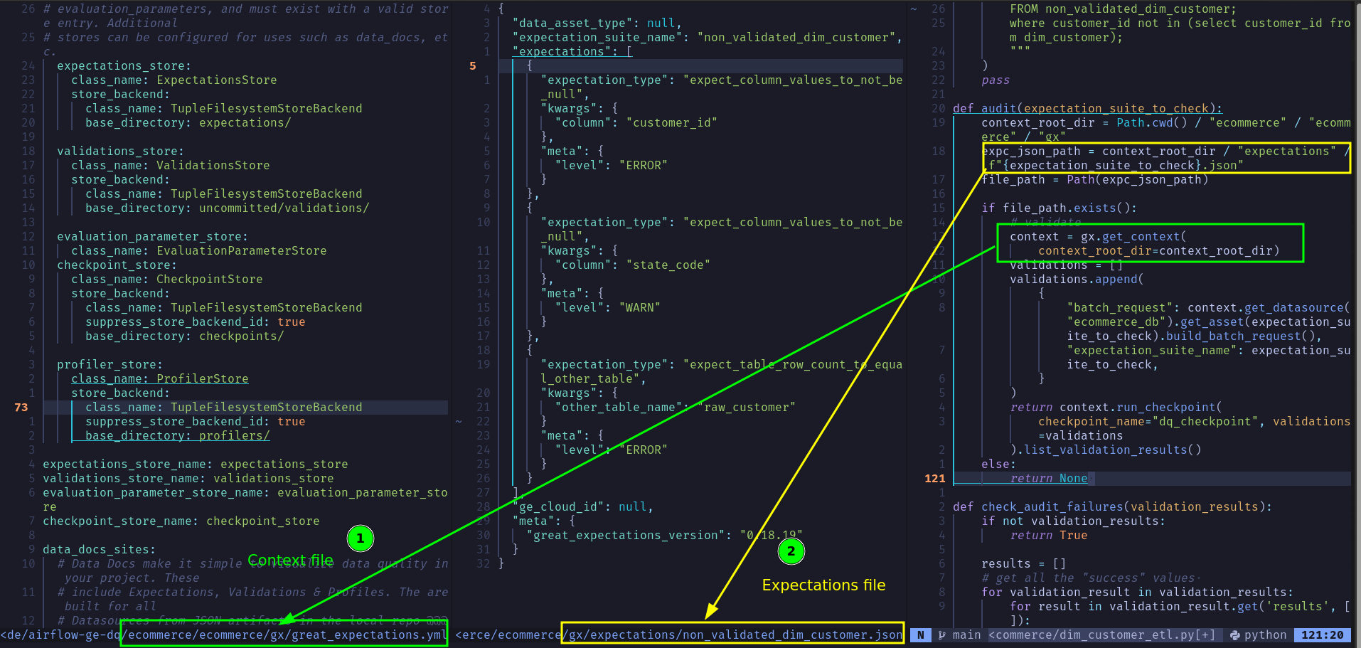 Expectations: These denote what you expect from a dataset. The greatexpectations library allows us to check if the dataset meets these expectations. In our example, the expectations are defined here. This is where your define your DQ checks to be run.Validations: The results of checking if a dataset meets its expectations are called validations. The greatexpectations library allows us to capture both successes and failures. In our example, the validations are stored in the location./ecommerce/ecommerce/gx/uncommitted/validations/dim_customer_dt_created_count/__none__/and are not included as part of version control. Run the ETL pipeline atleast once to see this. We use this audit method to run the respectiveexpectation_suite(list of expectations).Data sources: define the data that greatexpectations will access. Each data source (sql db, spark, csv files, etc.) can have one or more data assets (e.g., table, dataframe, files under specific folder, etc.). In our example, we have onesqlite3data source, multiple tables, and a custom query data asset defined here. We can addbatch_metadatathat allow us to restrict the partition of each run, sort order, etc.Checkpoint: With checkpoints, you can tell greatexpectations which expectations to run, where to store the results, what actions to take after checks are run, etc. Think of it as a customizable way to define what to do, and we can tell greatexpectations to run a specific checkpoint via code. Note that we can define multiple checkpoints. We have a checkpoint defined here.Context: Think of thecontextfile as a config file that shows where the components necessary for greatexpectations are stored. We have our context defined here. The greatexpectations library uses acontextto describe the following:- Expectations storage location with
