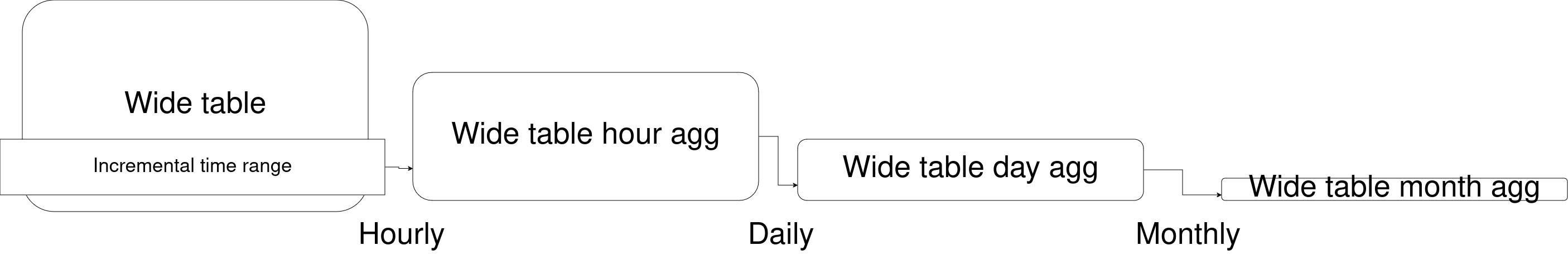 Build aggregate tables incrementally, i.e. don’t use the entire wide table to create aggregate tables. Only aggregate the past n time period(n depends on your use case).- Store the metrics that make up the non additive metrics as individual columns. For example if you have to create average, percentage, etc store sum and count as individual columns.