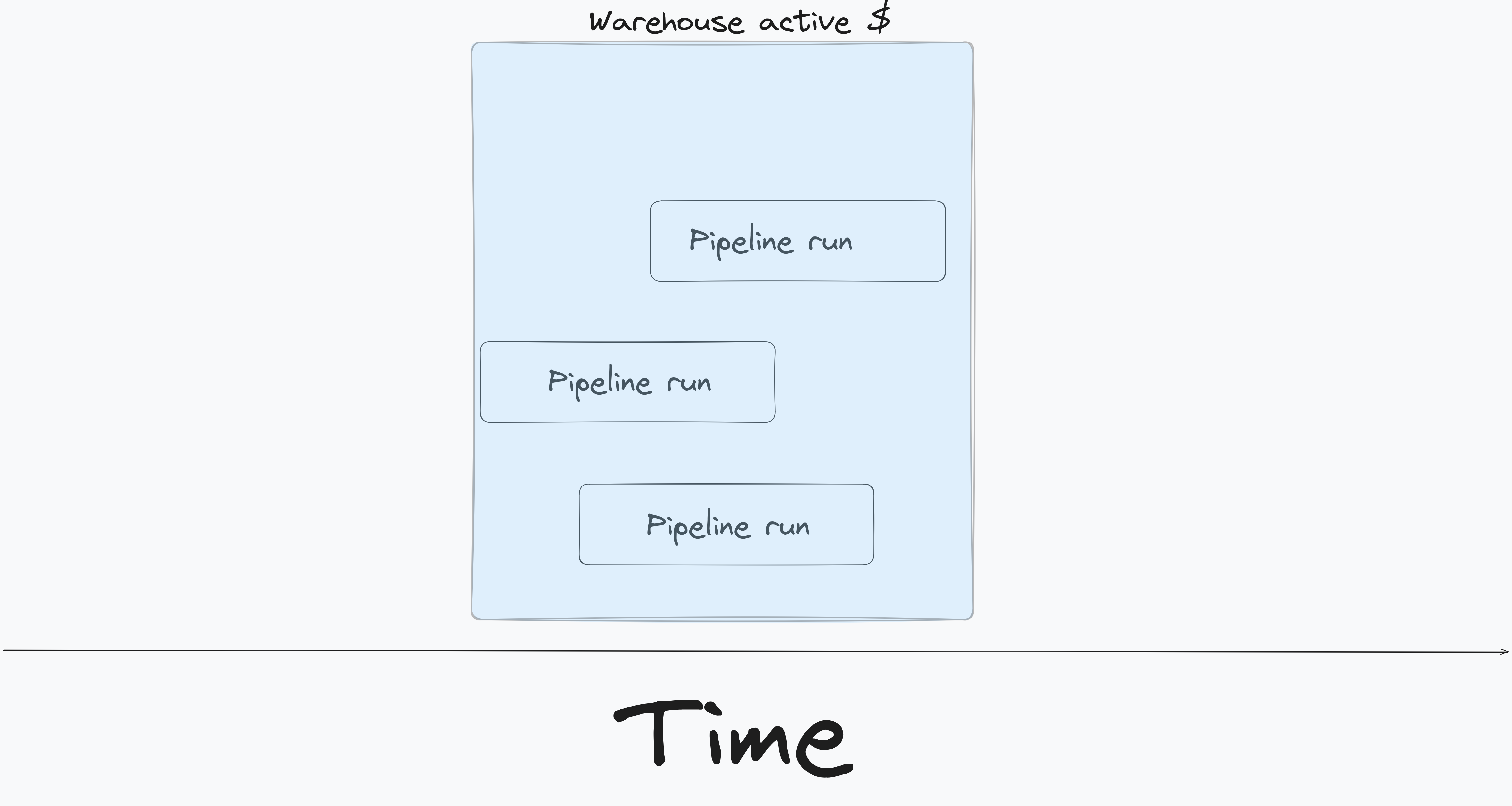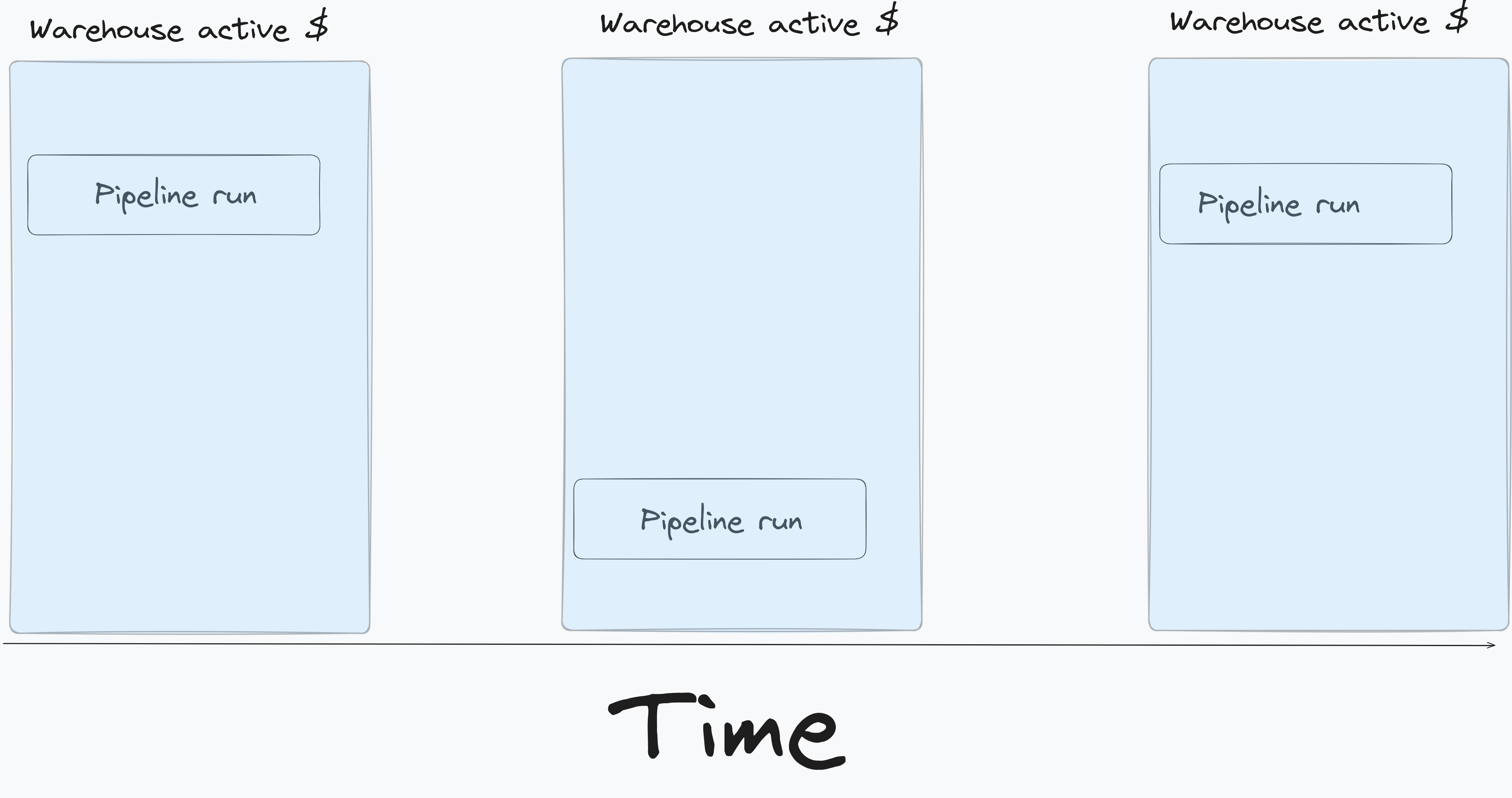 Snowflake charges based on the amount of time your warehouse is active. From the above pattern we can see that we will pay for 3 warehouse activity periods, say $$$. However if we can batch our data pipelines to run at/around the same time (as shown below) we can see that we will pay for only one warehouse activity period, so $.
