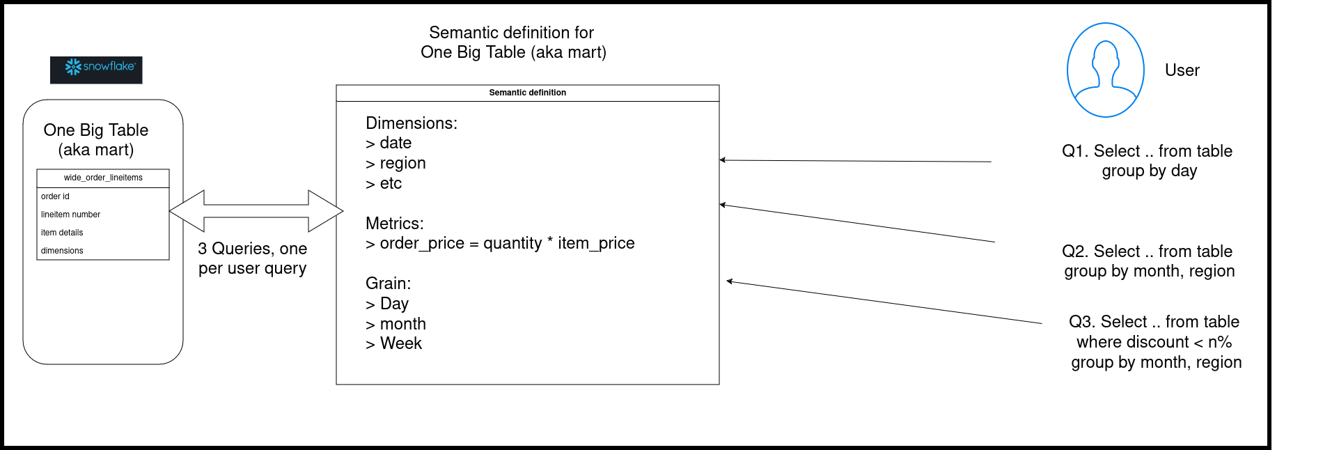 Let’s look at a simple semantic layer implementation on top of a wide table (fact + multiple dimension table). The wide tables, aka One Big Table, aka mart table are a common pattern in data pipelines.