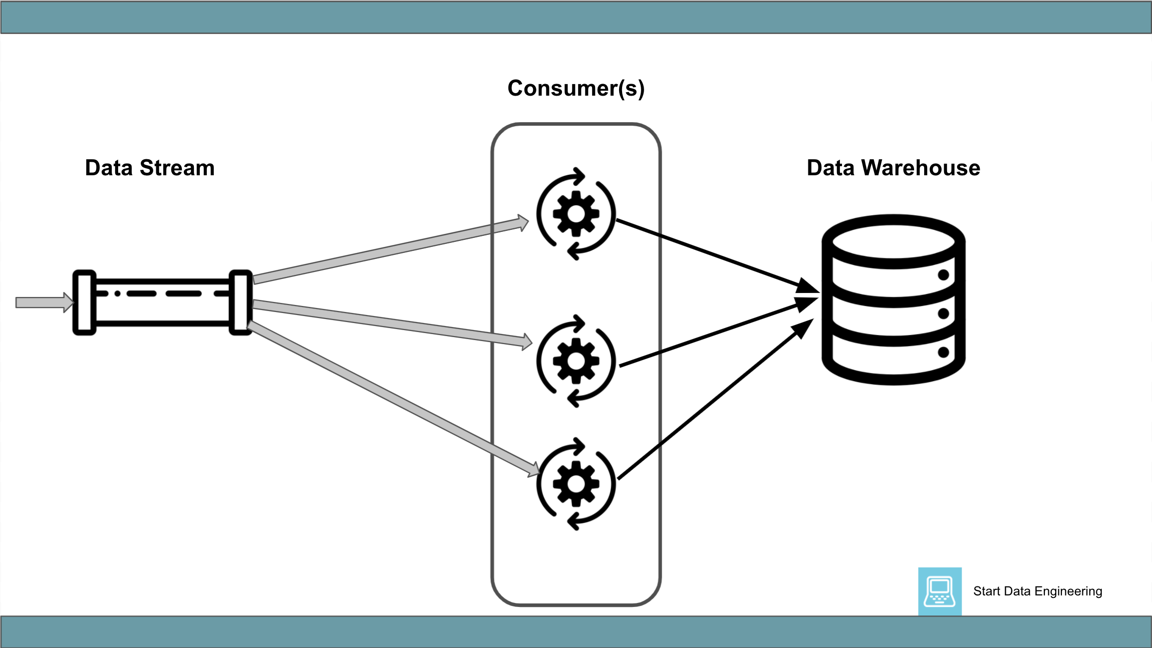 This generally involves a data stream (being fed by another process) and a consumer of this data stream. The consumer process consumes records, performs data enrichment (optional), collects a batch of records in memory, and inserts it into a data warehouse.