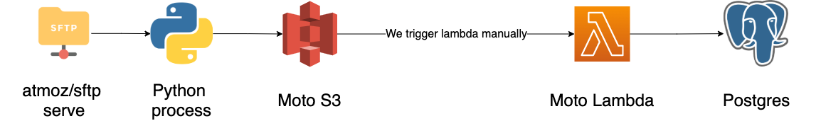 - Moto server to mock S3 and Lambda
