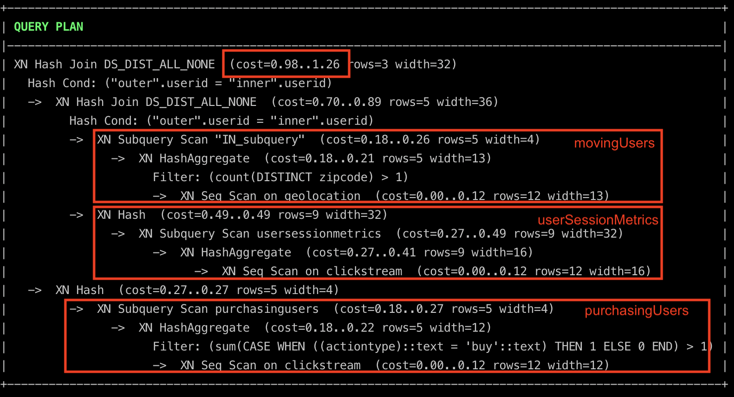 movingUsers(theINsubquery) anduserSessionMetricsin parallel and join them. - While simultaneously filtering