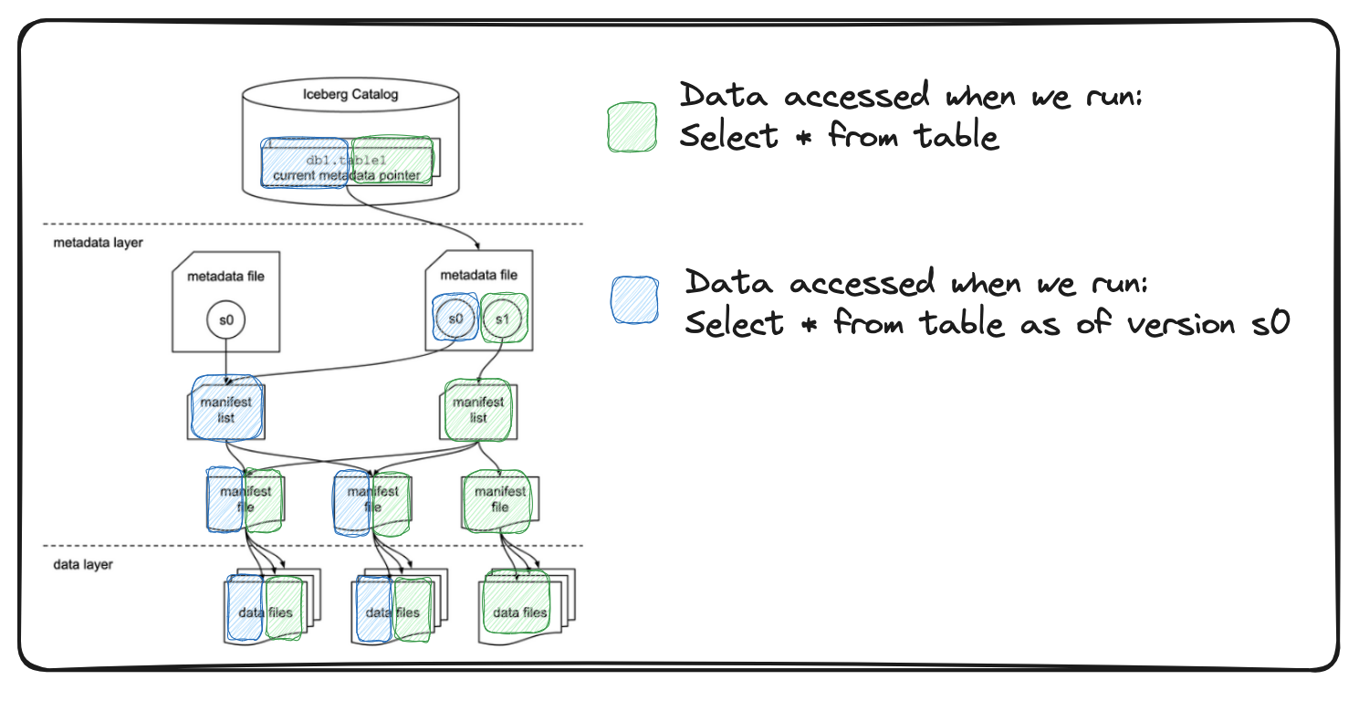Since metadata files track all the changes in data (& data/partition schema), we can return to a point-in-time table state(aka time travel). E.g., If you want to see what a table looked like four days ago, you can do this using time travel.