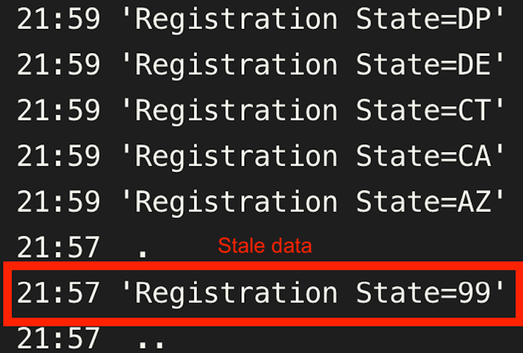 Let’s assume that the next day, you realize that there are records with Registration state = 99. You decide to filter it out and reprocess the previous day’s data with the new logic (aka backfill).