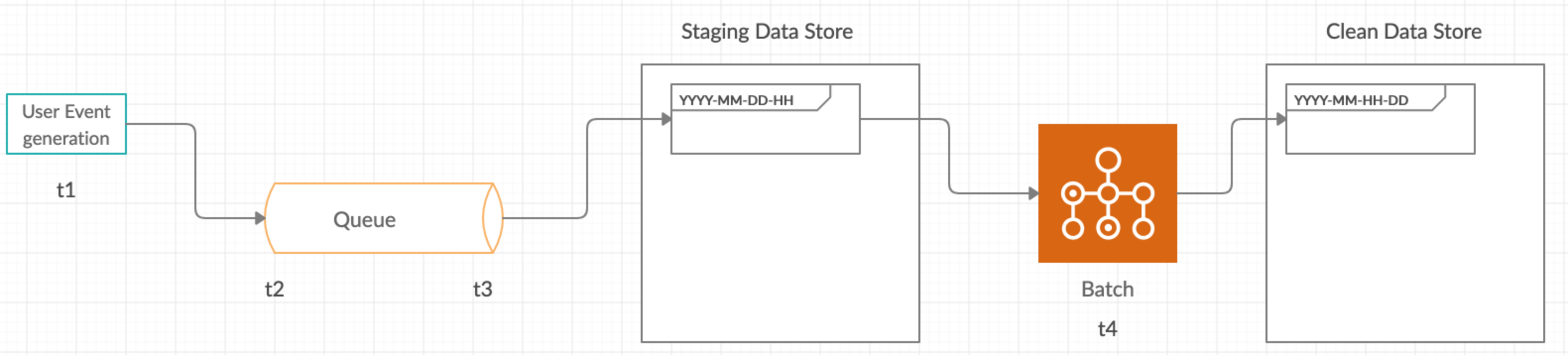 - The events from the queue are written to a raw staging data store (eg. AWS S3), partitioned by date with hour level granularity yyyy-mm-dd-hh. The level of granularity depends on the use case.