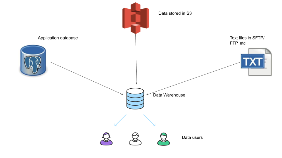 A very common use case in data engineering is to build a ETL system for a data warehouse, to have data loaded in from multiple separate databases to enable data analysts/scientists to be able to run queries on this data, since the source databases are used by your applications and we do not want these analytic queries to affect our application performance and the source data is disconnected as shown below.