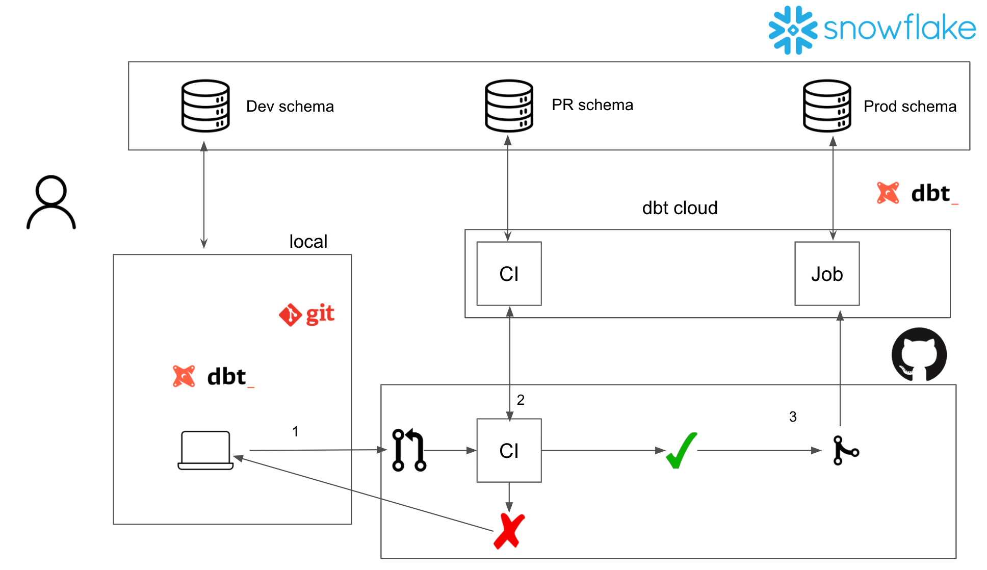dbt_cloud_pr_*. - Create the models in the unique schema and run the defined tests.