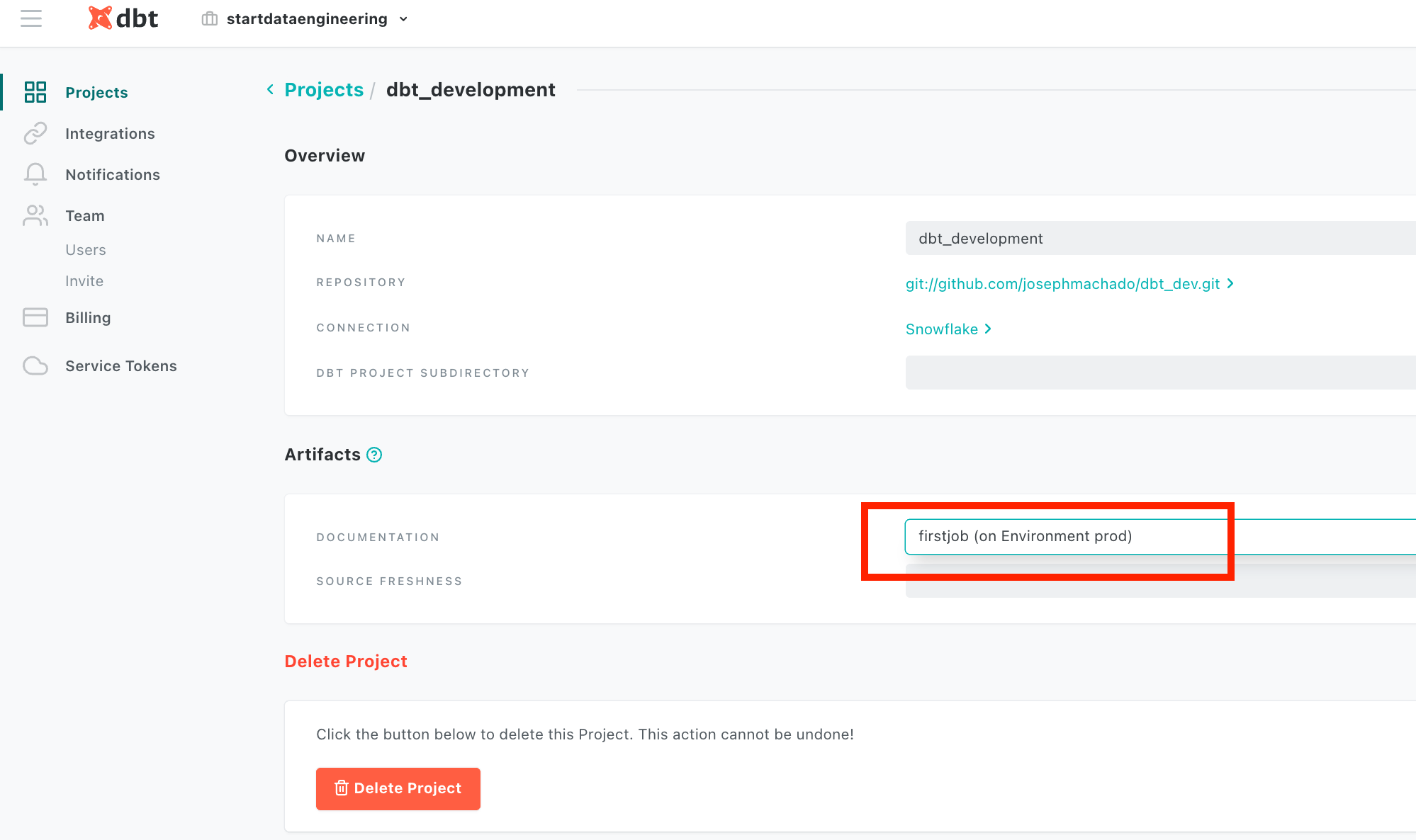 One of the most powerful features of dbt is its hosted documentation. Dbt allows us to specify column and table descriptions as part of your schema files. This documentation can be viewed by anyone with access to dbt cloud. We can generate documentation for any job from the project settings page. Click on hamburger icon -> Account Settings -> Project. On this page, select the job whose data documentation you want hosted by dbt cloud. Dbt cloud will show the documentation from the latest run of the selected job.