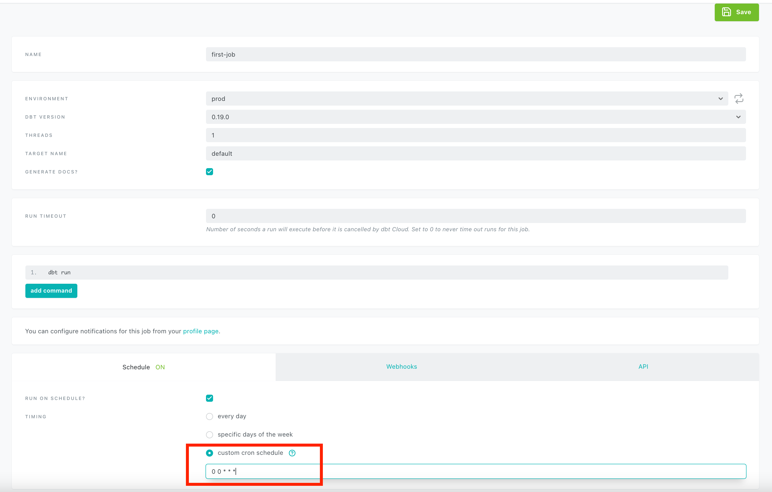 Now dbt cloud will take care of running this job every day as 12 AM for you. Note that we also check the GENERATE DOCS checkbox.