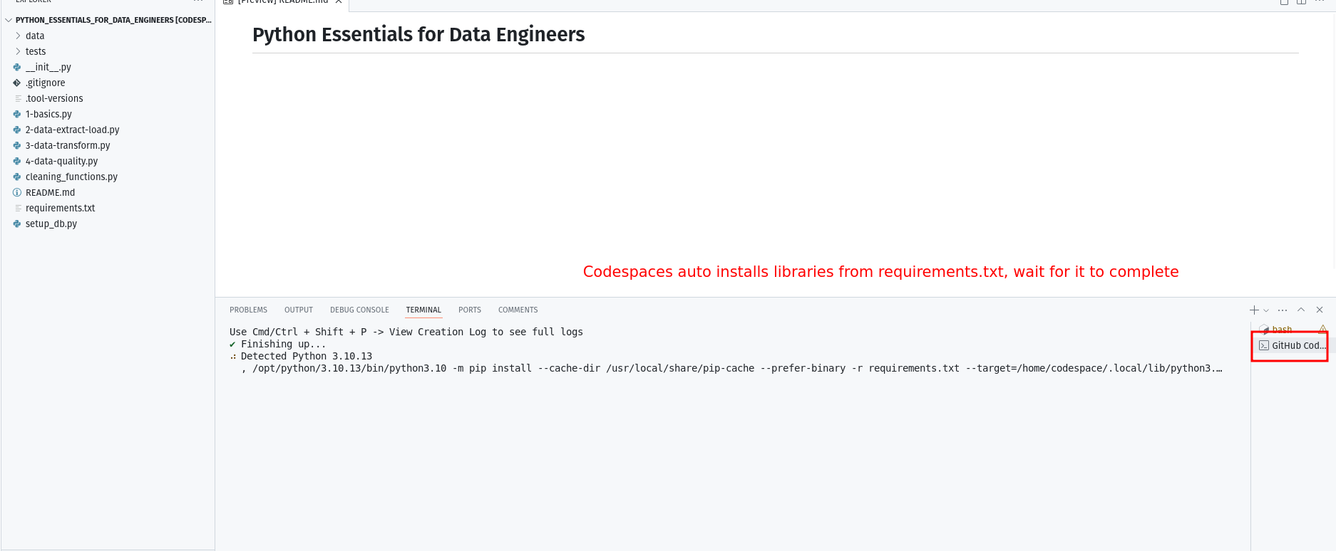 When codespaces open, wait for it to complete installing the required libraries from ./requirements.txt.