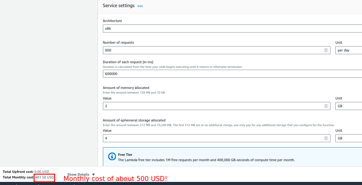 We can easily fit the files in memory if we assign a VM with 2GB memory and 4GB disk space. Thus, our lambda costs will be only 500 USD per month