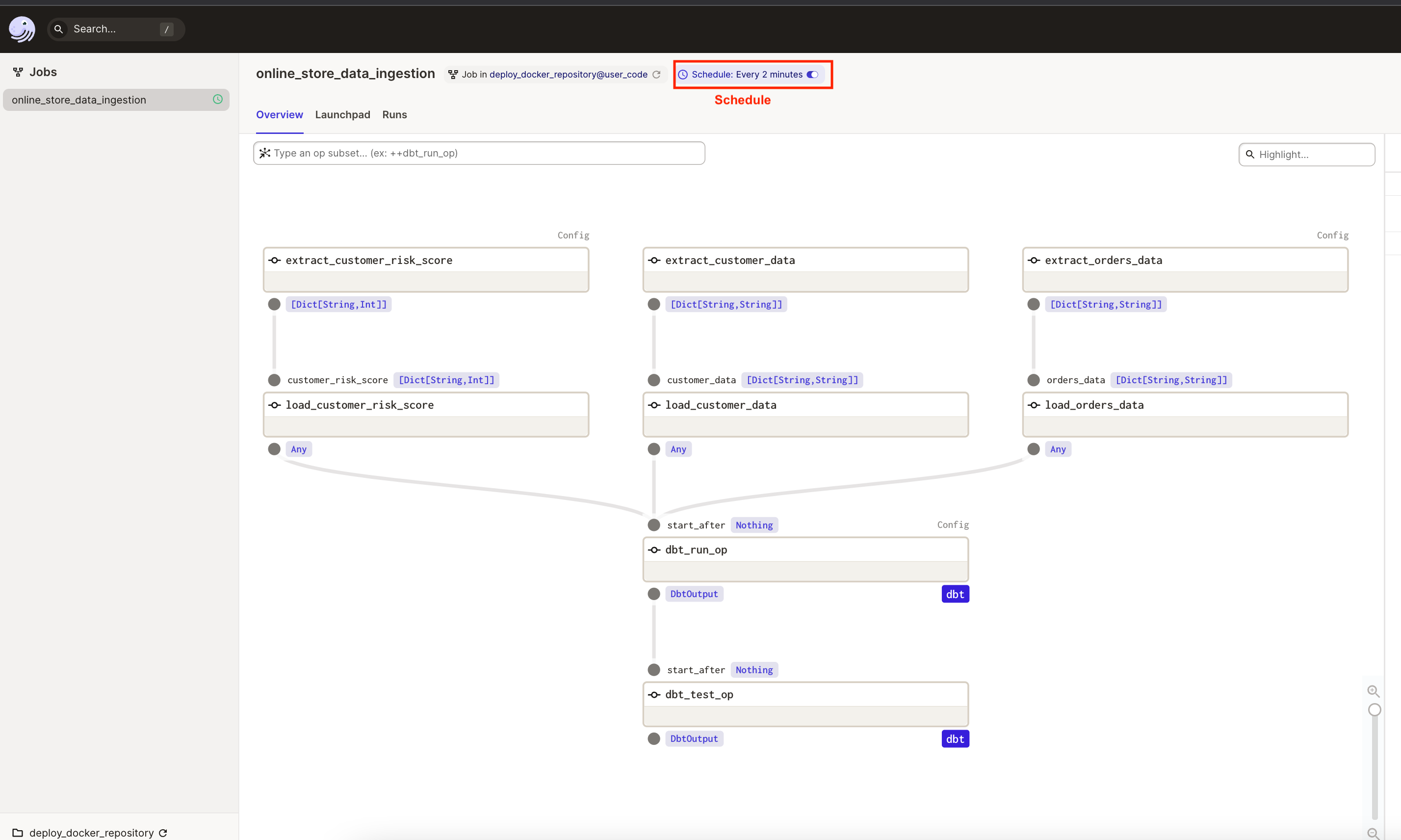 : We use a job to define the order of execution of operations. Our data ingestion job is defined here.schedules