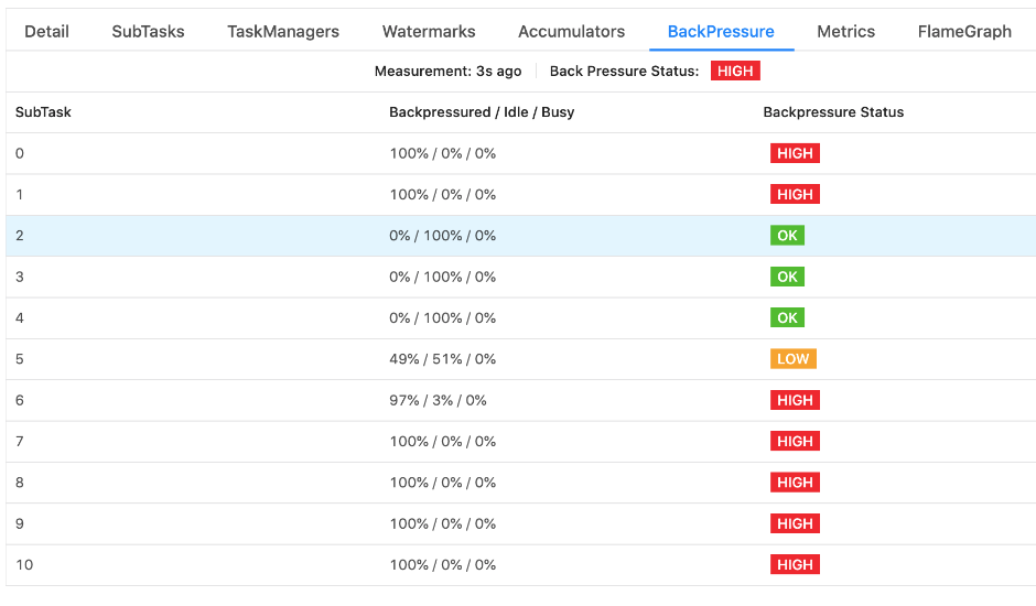 When an upstream process/system produces data at a rate faster than a process can keep up. Backpressure causes data to be accumulated in memory (unless the upstream system is an external one like Kafka), which, if left unchecked, can cause out-of-memory errors. We can monitor this via the Flink UI.