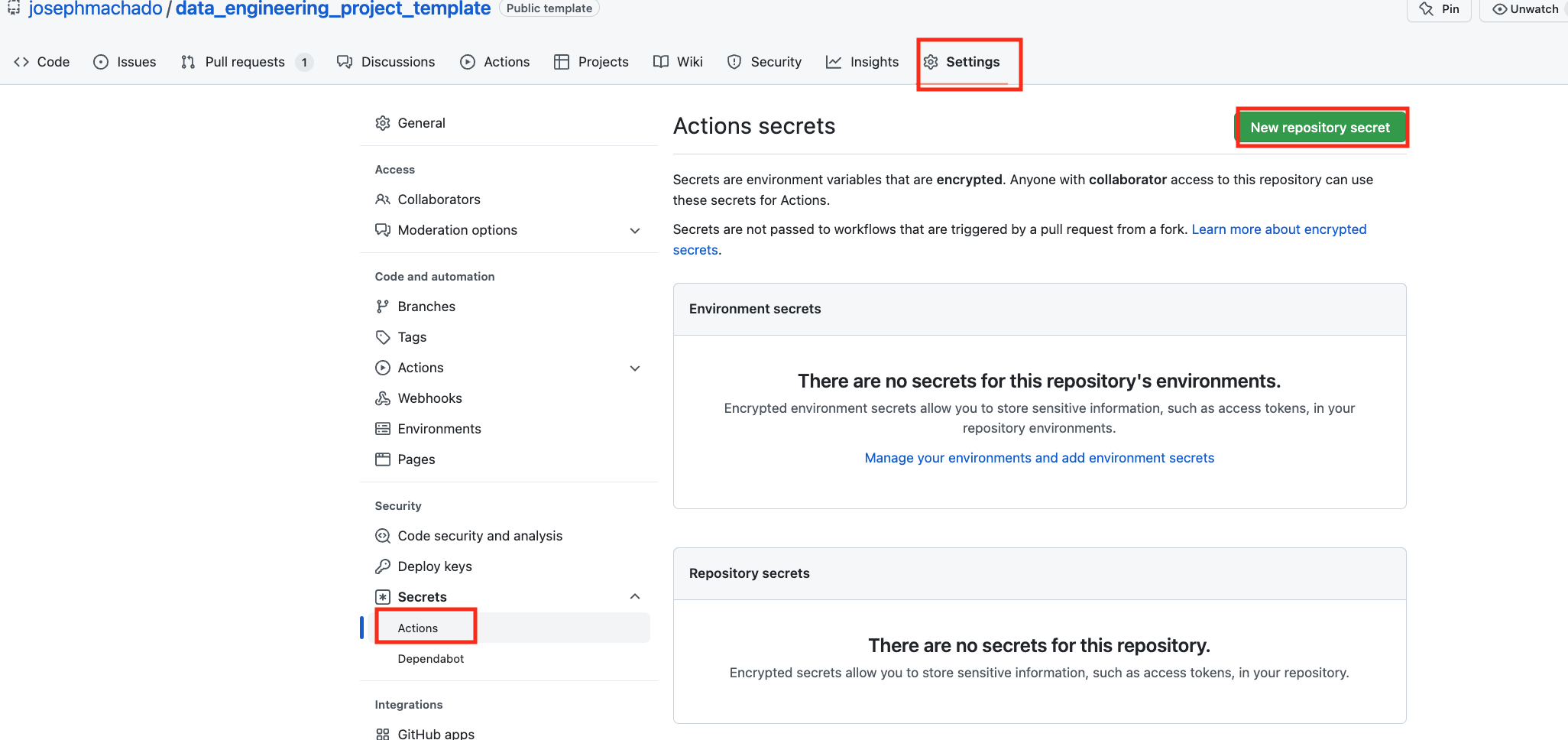 - Create codespaces by going to the data_engineering_project_template repository, cloning it(or click