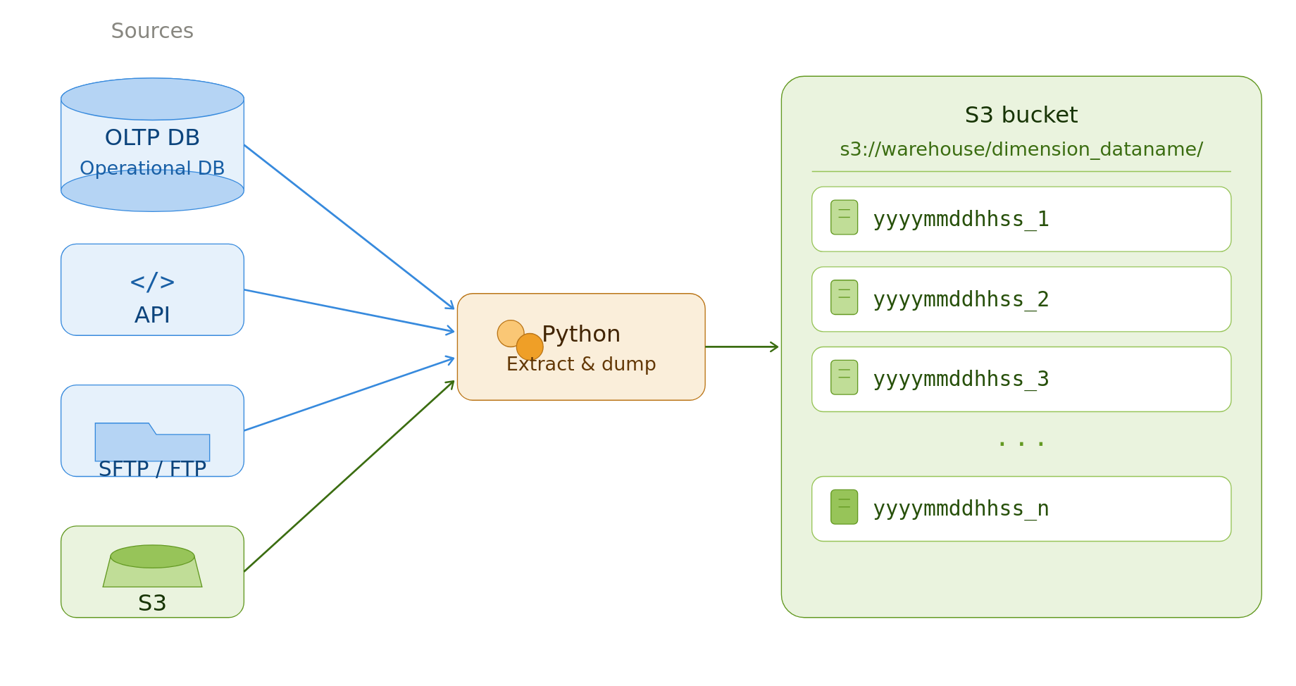 Data from source systems like OLTP DB, SFTP/FTP servers, cloud storage, API are extracted as a batch process.