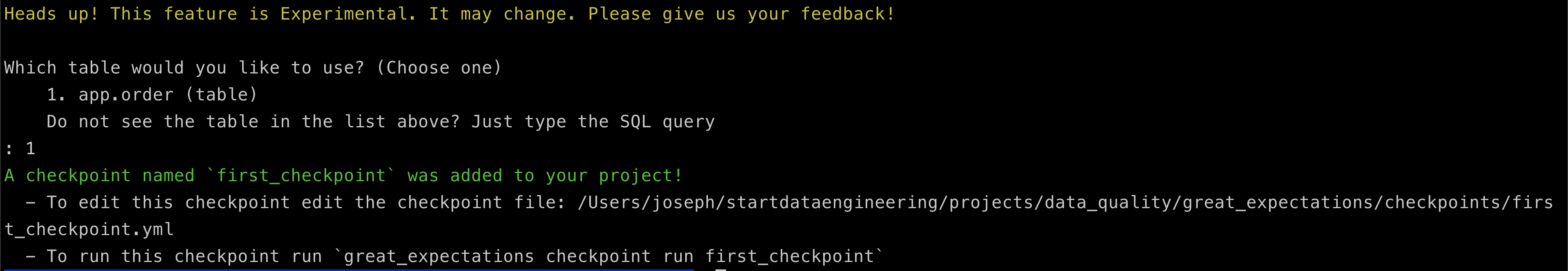 Now its time to run our expectations, In great expectations running a set of expectations(test cases) is called a checkpoint. We have to create a checkpoint and define which expectations to run. Lets create a new checkpoint called first_checkpoint for our app.order.error expectation as shown below.