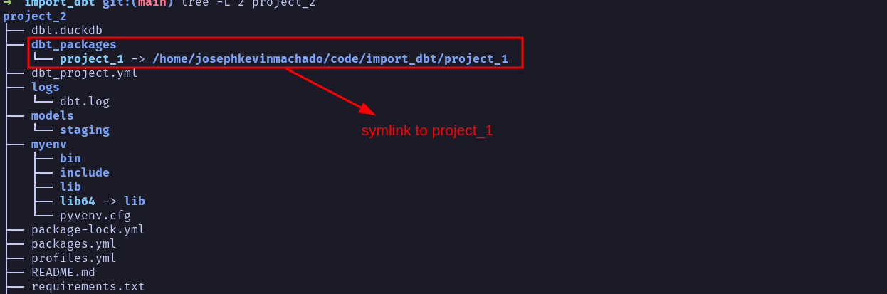 Since we are using a local filesystem to access our dbt package, we can see a symlink to it after running dbt deps