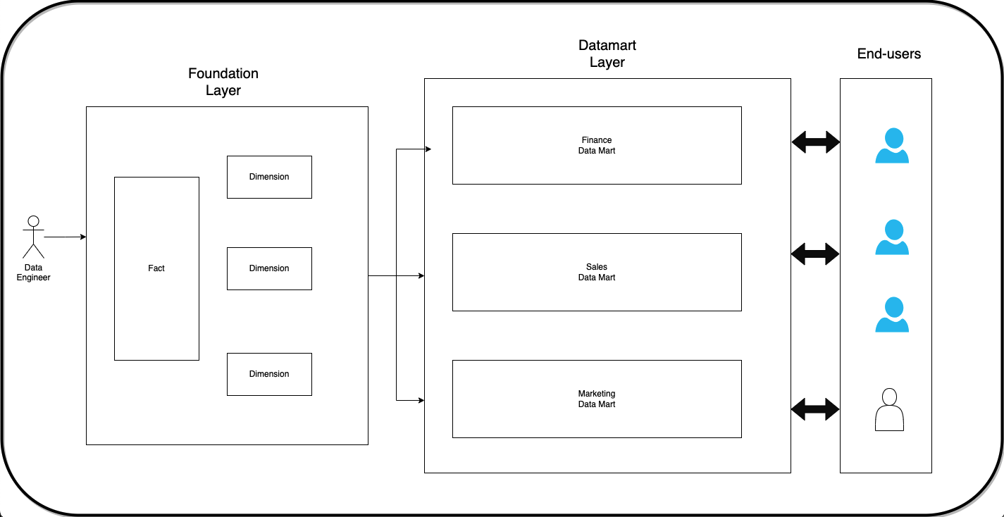 Ensure the data in the data mart layer can be traced back to the source tables (data lineage). Data mart datasets are made available for end-user querying. Advanced end-users can access the fact/dim tables if needed.