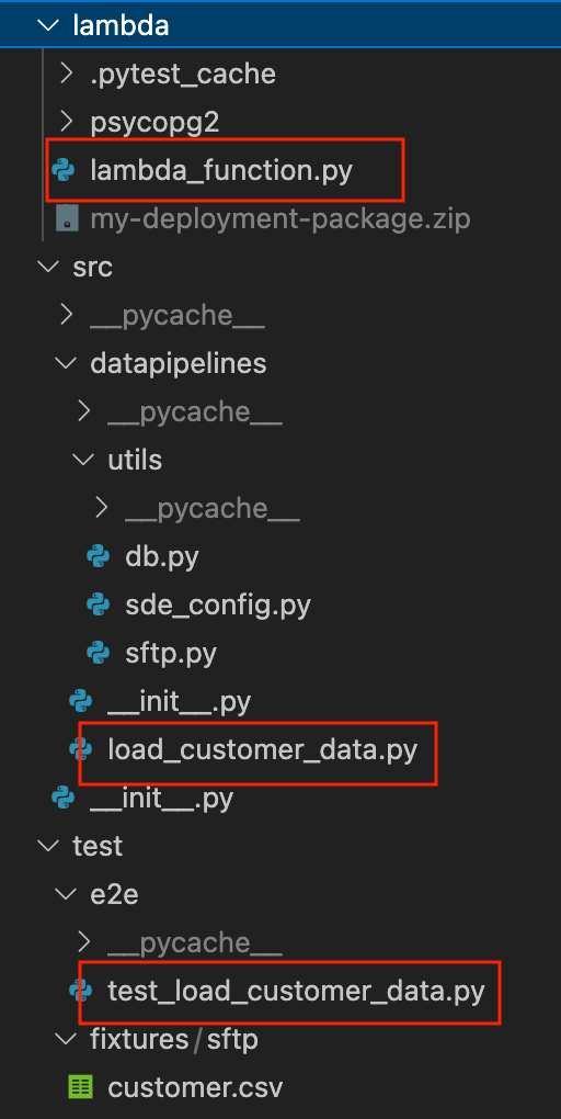 load_customer_data.pyis the main ETL function, it copies data from the SFTP server to an S3 file.utilsfolder has helper functions to connect to different components.lambda_function.pyreads data from the S3 file and inserts it into a warehouse table. This will be the code deployed in our lambda function.test_load_customer_data.pyruns the ETL and tests that the data in./test/customer/fixtures/sftp/customer.csvthat we put in the local sftp server, make it into the warehouse table.