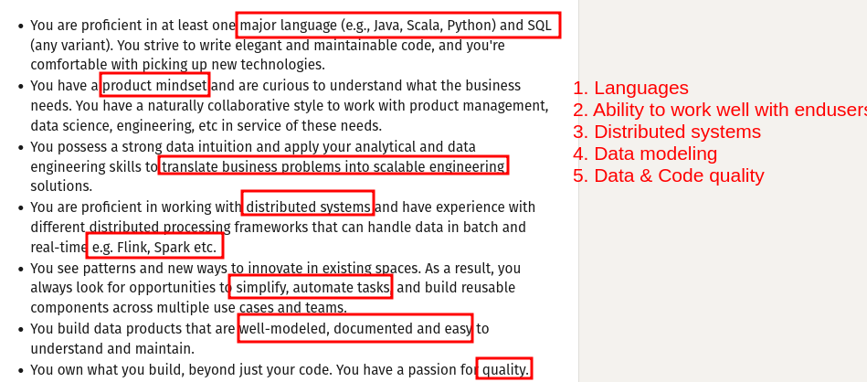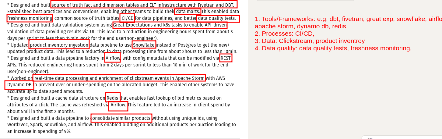 Languages usedData tools usedInfrastructure (AWS, GCP, Databricks, etc)Data flow and modeling used (e.g., Medallion, dbt flow, Kimball dimensional modeling, data vault, etc.)Processes used (CI/CD, DQ measurements, etc)Types of data that they work with