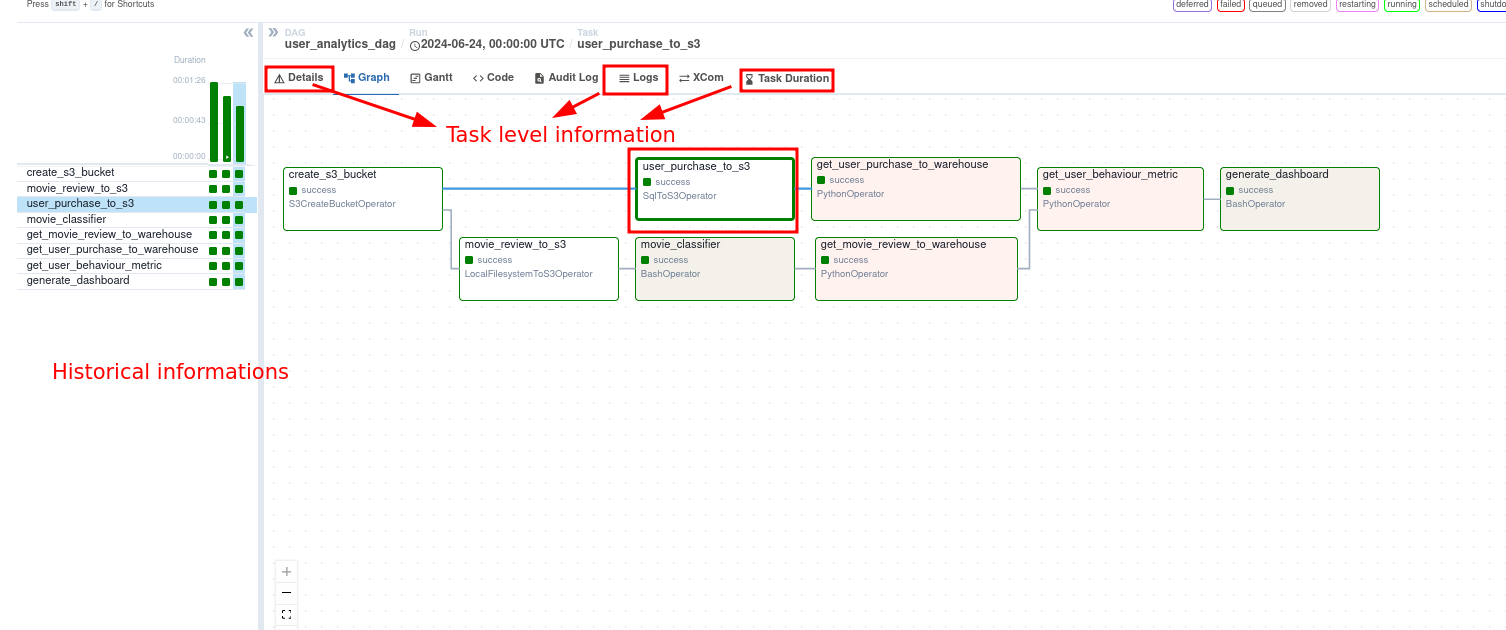 When a data pipeline runs, all information is stored in a metadata db and as logs. The historical information allows us to observe your data pipelines’ current state and historical state.