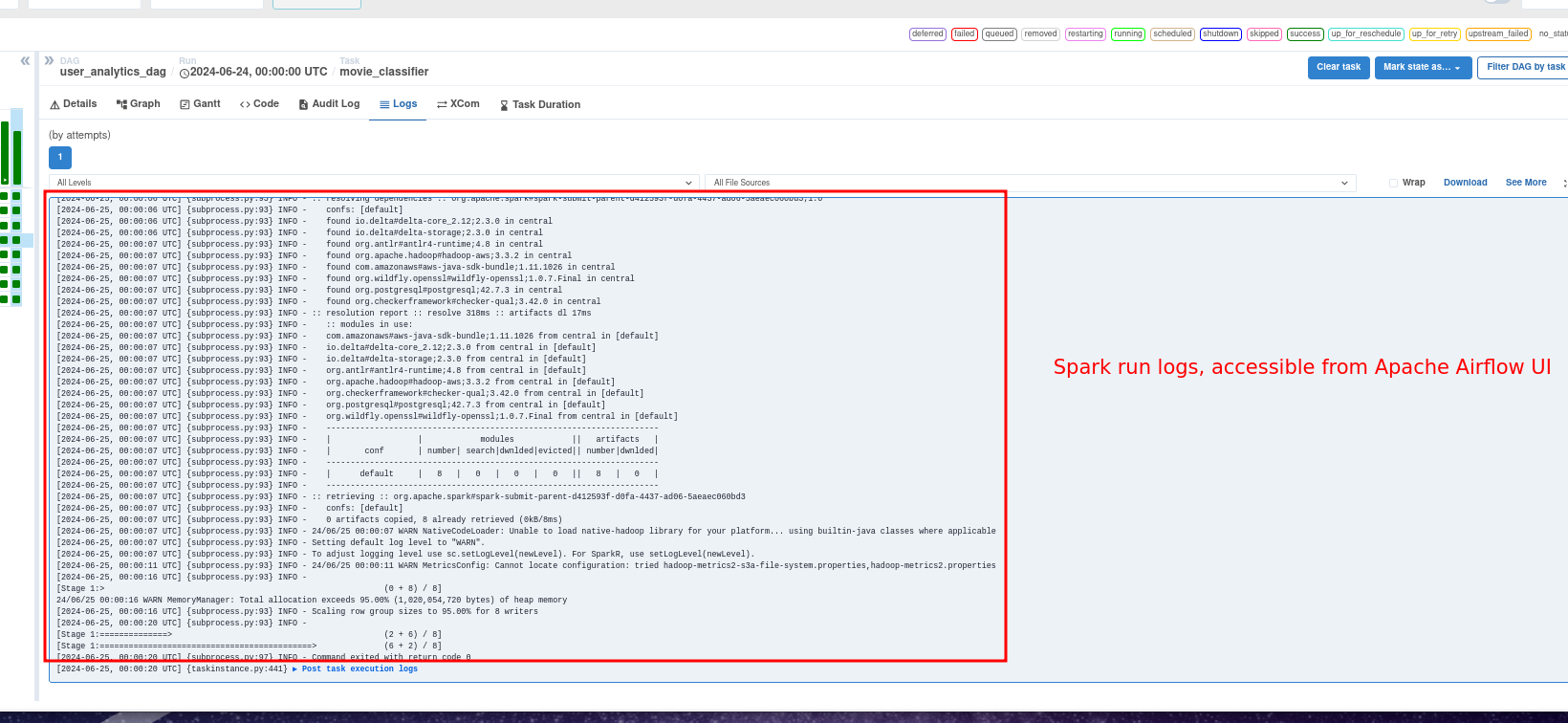 When we run data pipelines, we can use a nice web UI to see the progress, failures, and other details. Powered by the metadata db and the logs, we can also see individual task logs and the inputs to a specific task, among others.